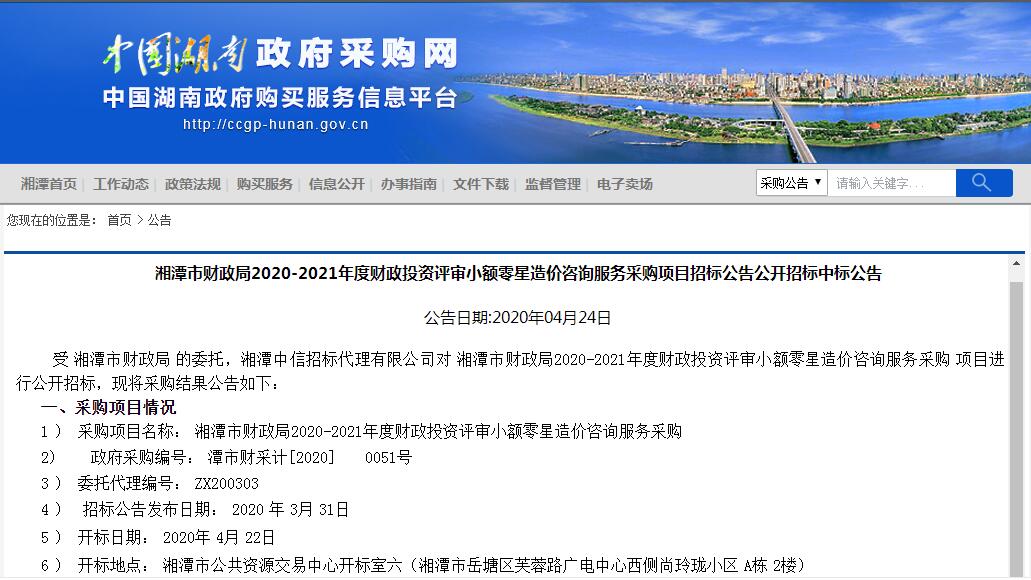 湘潭市財(cái)政局2020-2021年度財(cái)政投資評(píng)審小額零星造價(jià)咨詢服務(wù)采購(gòu)項(xiàng)目招標(biāo)公告公開招標(biāo)中標(biāo)公告