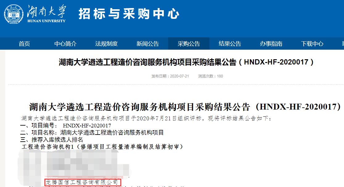 恭賀本公司中標(biāo)湖南大學(xué)工程造價(jià)咨詢服務(wù)機(jī)構(gòu)庫(kù)