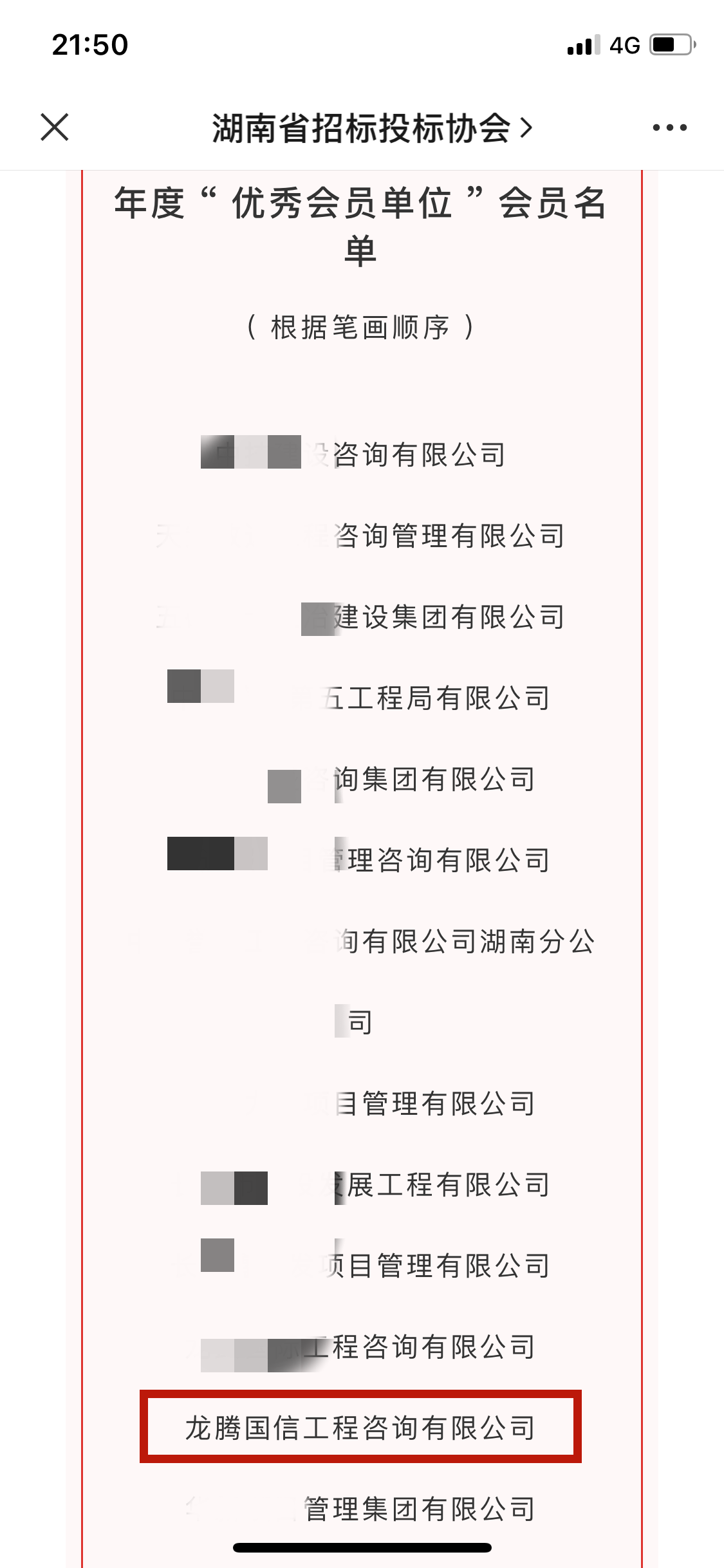 近日,在湖南省招標(biāo)投標(biāo)協(xié)會(huì)組織的表彰通告中,龍騰國(guó)信工程咨詢(xún)有限公司榮獲“2020年度優(yōu)秀會(huì)員單位”。同時(shí),公司李超先生獲協(xié)會(huì)“優(yōu)秀特約聯(lián)絡(luò)員”稱(chēng)號(hào)。