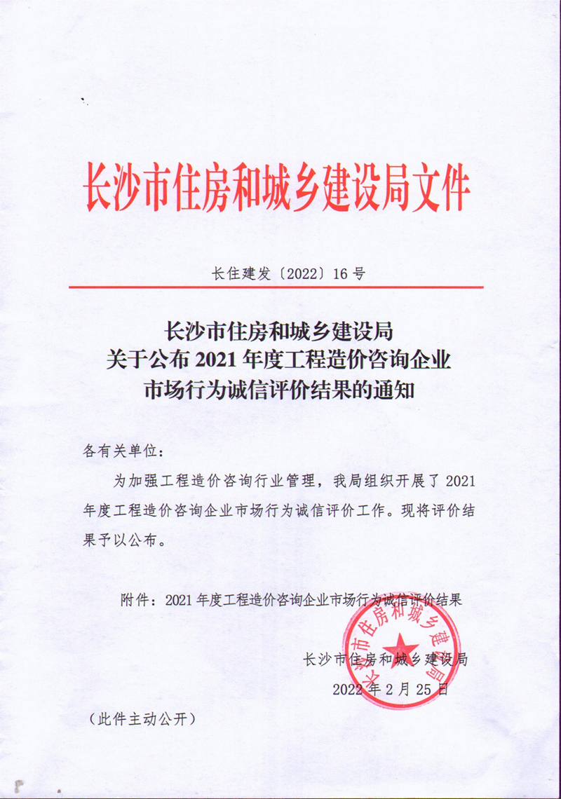 長沙市住房和城鄉(xiāng)建設(shè)局為加強工程造價咨詢行業(yè)管理,組織開展了2021年度工程造價咨詢企業(yè)市場行為誠信評價工作,我單位獲評“2021年度工程造價咨詢企業(yè)信用等級AAA”。