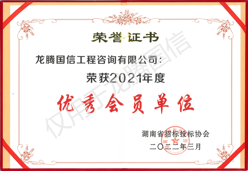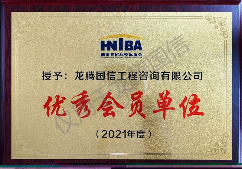經(jīng)評(píng)審小組評(píng)審,龍騰國(guó)信工程咨詢(xún)有限公司榮獲湖南省招標(biāo)投標(biāo)協(xié)會(huì)2021年度“優(yōu)秀會(huì)員單位”榮譽(yù)稱(chēng)號(hào)。