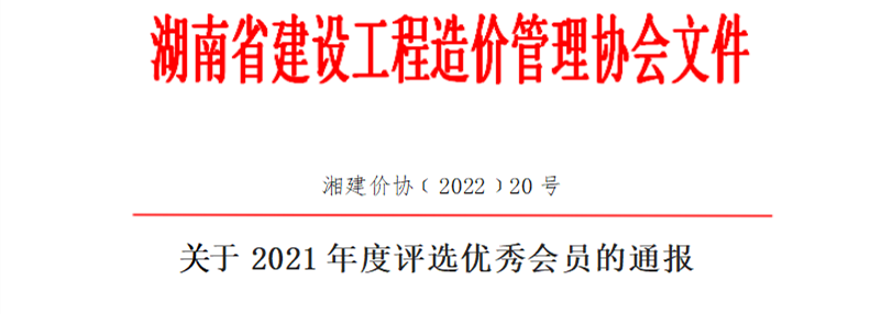 近日,為促進(jìn)省內(nèi)工程造價(jià)咨詢行業(yè)高質(zhì)量發(fā)展,樹立先進(jìn)典型,調(diào)動會員的積極性和創(chuàng)造性,根據(jù)《湖南省建設(shè)工程造價(jià)管理協(xié)會關(guān)于開展2021年度評選優(yōu)秀會員活動的通知》,經(jīng)會員申報(bào)、評審小組評審、集體研究、結(jié)果公示等環(huán)節(jié),我單位榮獲“2021年度優(yōu)秀單位”、注冊造價(jià)工程師陳建榮(黨員)榮獲“優(yōu)秀個(gè)人”。