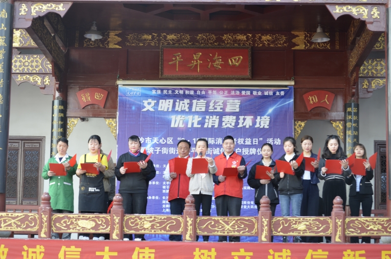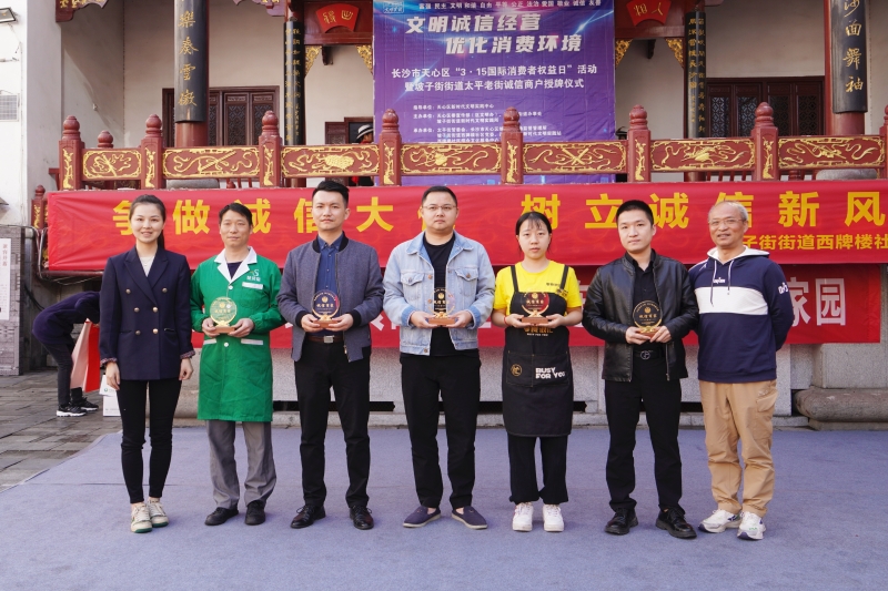 為營造誠信營商環(huán)境,發(fā)揮榜樣引領(lǐng)作用,努力營造誠信、安全、放心的消費環(huán)境,2023年3月14日上午,由天心區(qū)文明辦,坡子街道辦事處、坡子街新時代文明實踐所主辦,太平街管委會、坡子街市監(jiān)所、西牌樓社區(qū)承辦的“文明誠信經(jīng)營 優(yōu)化消費環(huán)境”長沙市天心區(qū)“3·15國際消費者權(quán)益日”活動暨坡子街街道太平老街誠信商戶授牌儀式活動在太平街古戲臺舉行,我單位獲評“誠信商家”。
