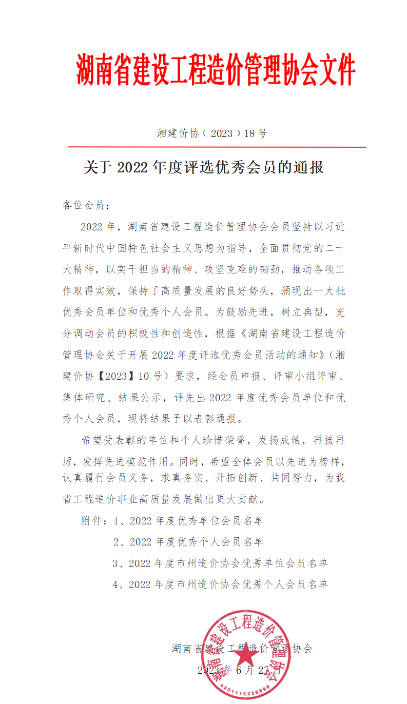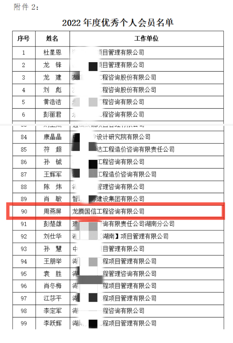 2022年,湖南省建設(shè)工程造價管理協(xié)會會員堅持以習(xí)近平新時代中國特色社會主義思想為指導(dǎo),全面貫徹黨的二十大精神,以實(shí)干擔(dān)當(dāng)?shù)木瘛⒐钥穗y的韌勁,推動各項工作取得實(shí)效,保持了高質(zhì)量發(fā)展的良好勢頭,涌現(xiàn)出一大批優(yōu)秀會員單位和優(yōu)秀個人會員。為鼓勵先進(jìn),樹立典型,充分調(diào)動會員的積極性和創(chuàng)造性,根據(jù)《湖南省建設(shè)工程造價管理協(xié)會關(guān)于開展2022年度評選優(yōu)秀會員活動的通知》(湘建價協(xié)【2023】10號)要求,經(jīng)會員申報、評審小組評審、集體研究、結(jié)果公示,“龍騰國信工程咨詢有限公司”榮獲湖南省建設(shè)工程造價管理協(xié)會2022年度“優(yōu)秀單位”、公司造價工程師周燕屏獲“優(yōu)秀個人”榮譽(yù)稱號。