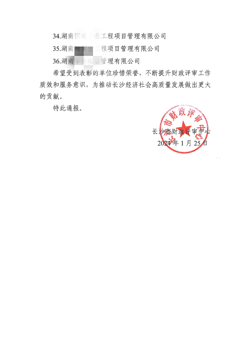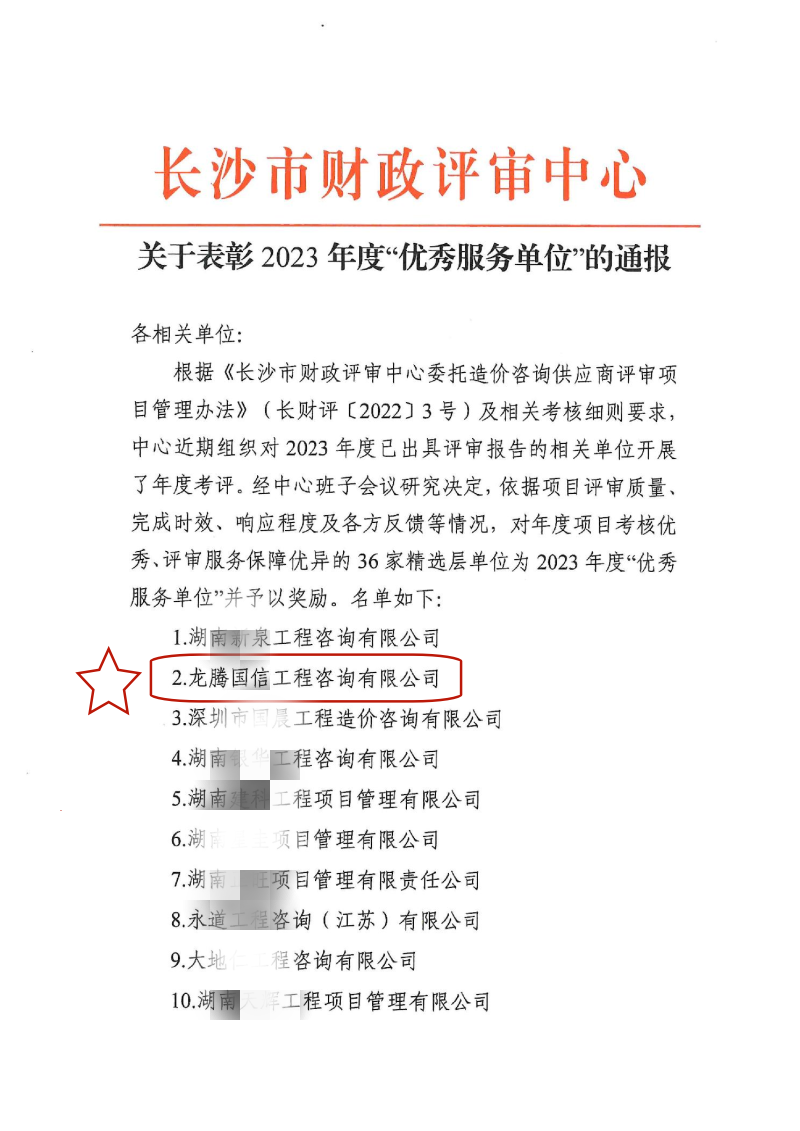 根據(jù)《長沙市財政評審中心委托造價咨詢供應(yīng)商評審項目管理辦法》(長財評〔2022〕3號)及相關(guān)考核細(xì)則要求,長沙市財政評審中心近期組織對2023年度已出具評審報告的相關(guān)單位開展了年度考評。經(jīng)長沙市財政評審中心班子會議研究決定,依據(jù)項目評審質(zhì)量、完成時效、響應(yīng)程度及各方反饋等情況,根據(jù)對年度項目考核優(yōu)秀、評審服務(wù)保障優(yōu)異的精選層單位評選,我單位龍騰國信工程咨詢有限公司被評為2023年度“優(yōu)秀服務(wù)單位”。