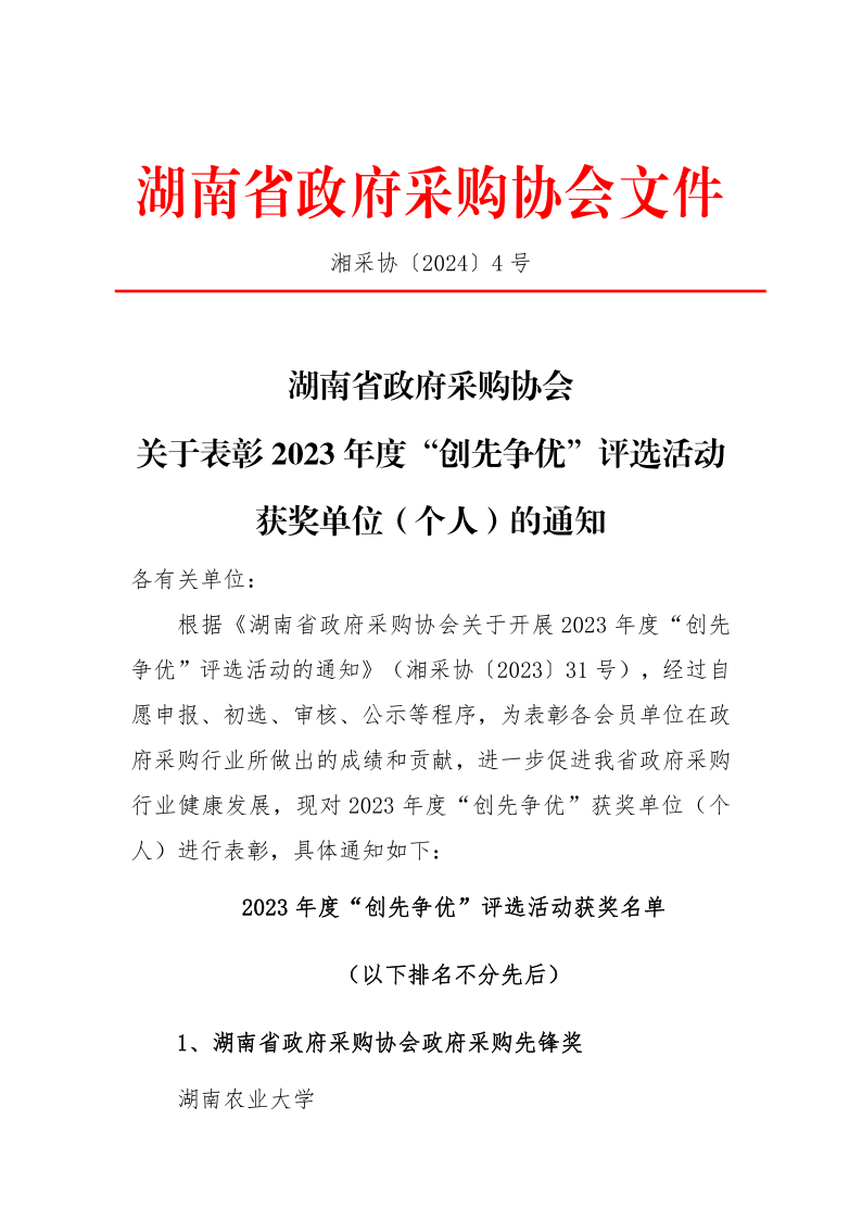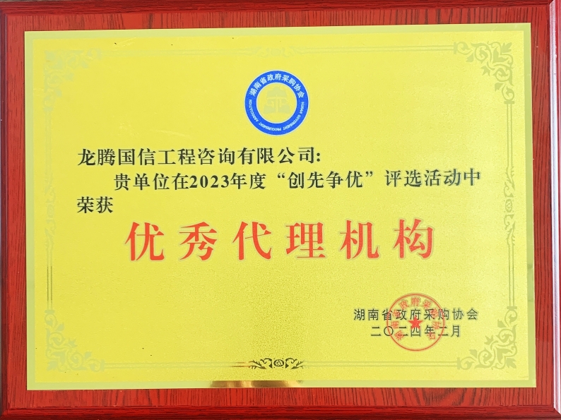 根據(jù)《湖南省政府采購協(xié)會關(guān)于開展2023年度“創(chuàng)先爭優(yōu)”評選活動的通知》(湘采協(xié)〔2023〕31號),為表彰各會員單位在政府采購行業(yè)所做出的成績和貢獻(xiàn),進(jìn)一步促進(jìn)我省政府采購行業(yè)健康發(fā)展,我單位獲評2023年度“優(yōu)秀代理機構(gòu)”。
