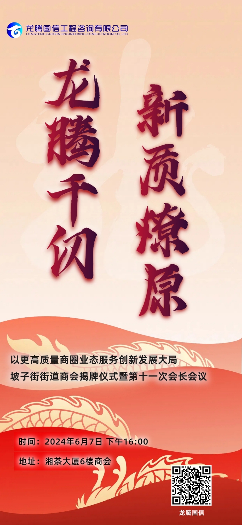 2024年6月,由龍騰國信工程咨詢有限公司承辦的‘龍騰千仞,新質(zhì)燎原’以以更高質(zhì)量商圈業(yè)態(tài)服務(wù)創(chuàng)新發(fā)展大局,坡子街街道商會揭牌儀式暨第十一次會長會議,在坡子街街道商會舉行。
