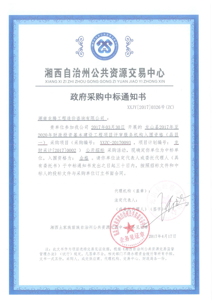 龍山縣財政局,對龍山縣財政投資評審中心聘用社會中介機構(gòu)協(xié)評政府性投資項目進行國內(nèi)公開招標。在此次公開招標活動中,通過公平、公開、公正的評比,我公司以優(yōu)異的成績獲得中標。