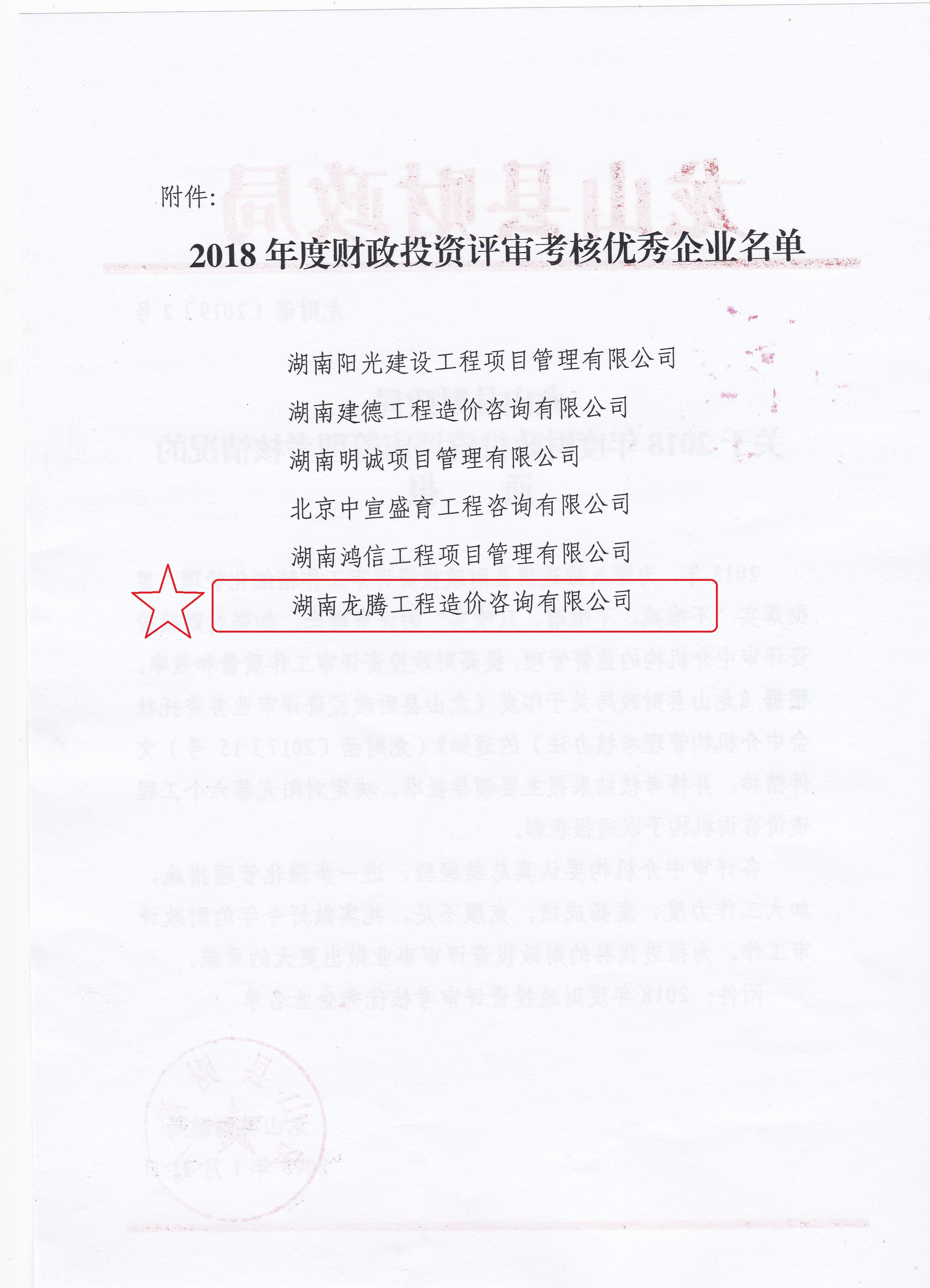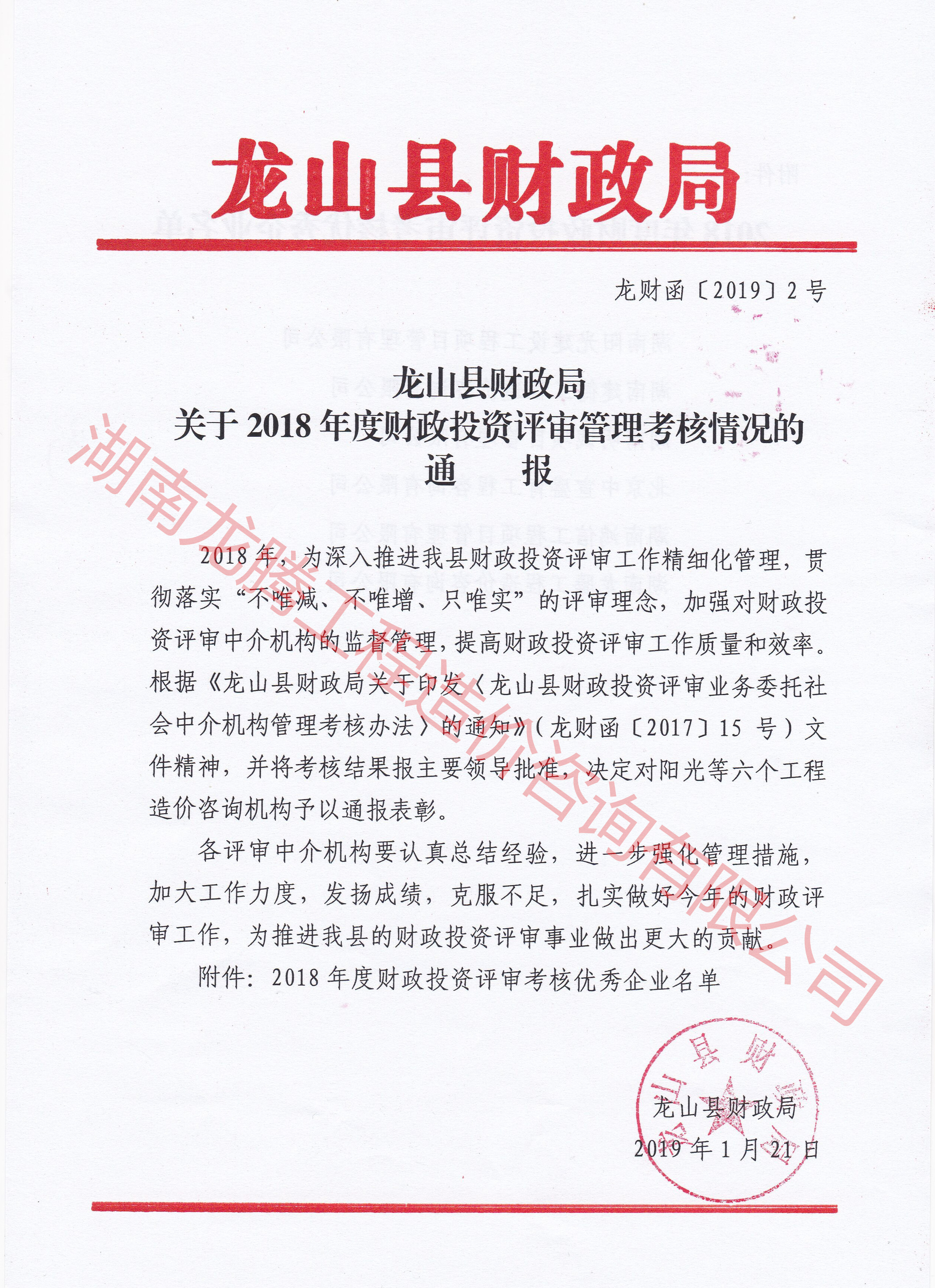 熱烈祝賀我公司被龍山縣財政局評為2018年度造價咨詢優(yōu)秀企業(yè)